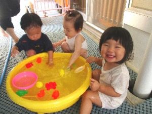 水の感触や音などに興味を持ち、水を使って季節の遊びを楽しみます。