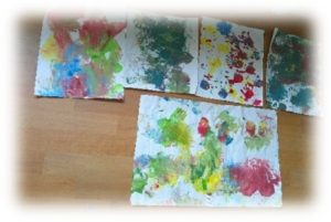 手、足、身体全部を使って思い思いに絵の具の感触を楽しんだり、好きな色を混ぜたり、色合いを楽しいだり、汚れることを気にせず、おもいっきり遊んだよ!!